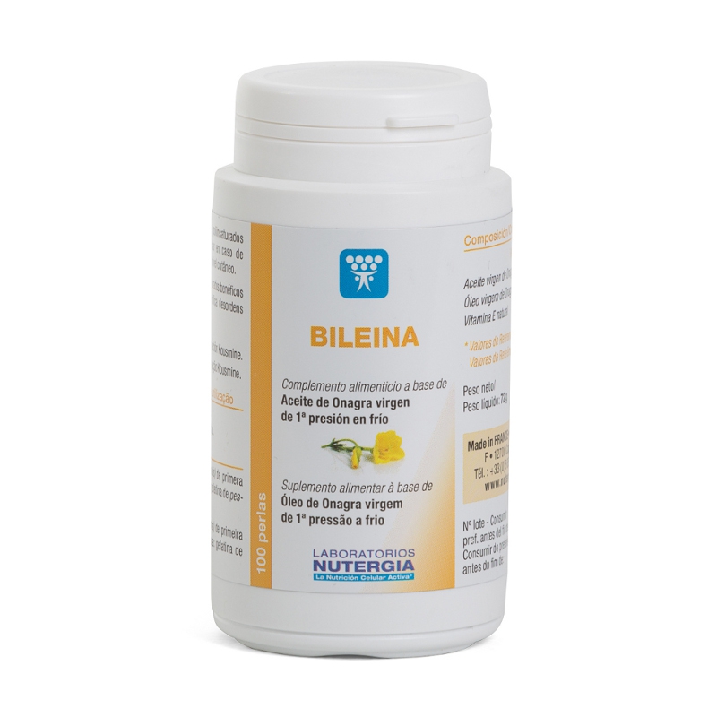 Bileina, aceite de onagra virgen de primera presión en frío, rico en AGPI de la familia ω6, tiene un papel de estructura a nivel de las membranas celulares. Favorece la síntesis de las prostaglandinas de tipo 1 (PGE1) moduladoras de la actividad celular y cuya carencia es responsable de numerosos trastornos.